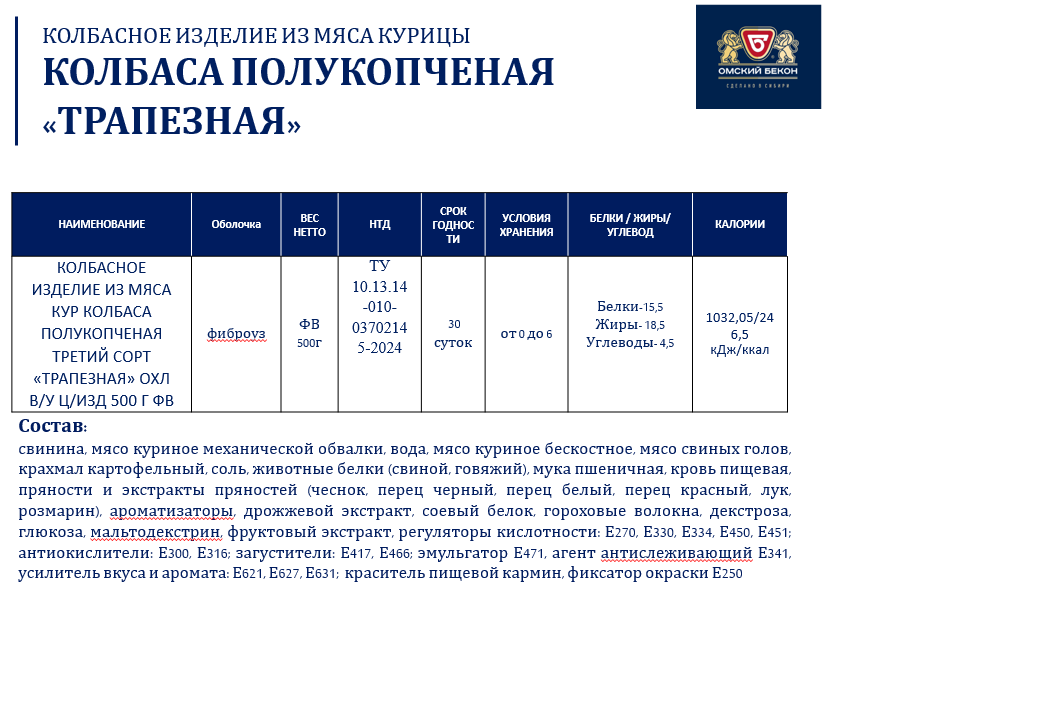Свинина, мясо куриное механической обвалки, вода, мясо куриное бескостное, мясо свиных голов, крахмал картофельный, соль, животные белки свиной, говяжий, мука пшеничная, кровь пищевая, пряности и экстракты пряностей чеснок, перец черный, перец белый, перец красный, лук, розмарин, ароматизаторы, дрожжевой экстракт, соевый белок, гороховые волокна, декстроза, глюкоза, мальтодекстрин, фруктовый экстракт, регуляторы кислотности: Е270, Е330, Е334, Е450, Е451; антиокислители: Е300, Е316; загустители: Е417, Е466; эмульгатор Е471, агент антислеживающий Е341, усилитель вкуса и аромата: Е621, Е627, Е631; краситель пищевой кармин, фиксатор окраски Е250.