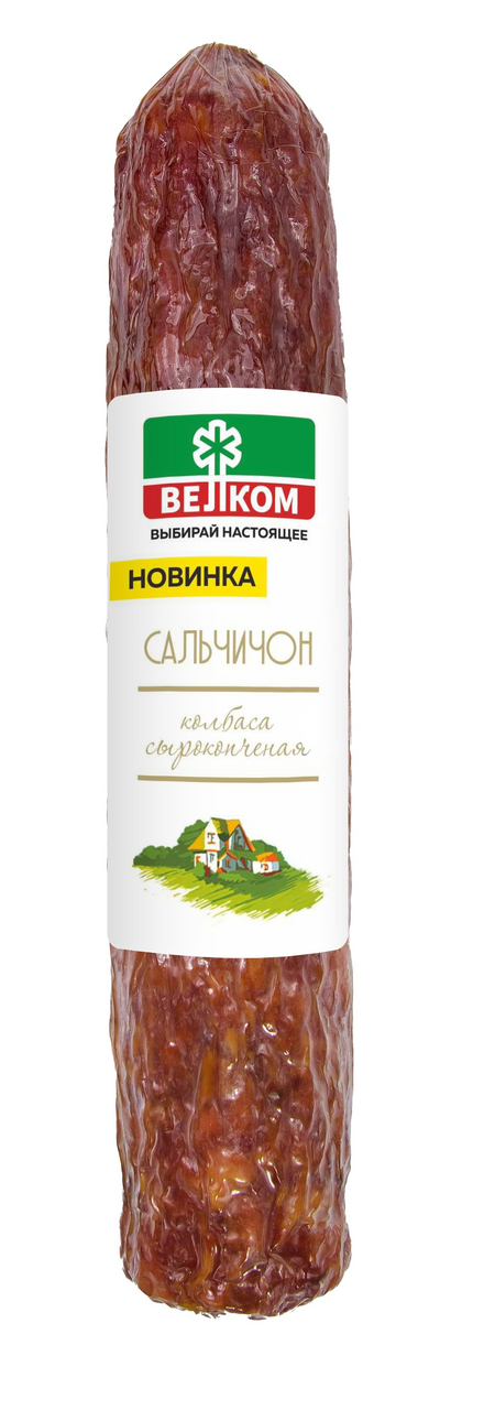 Колбаса сырокопченая Велком Сальчичон – выдержанный мясной деликатес с благородным насыщенным вкусом, гармонично дополненным пряными нотами. Это отличный выбор для праздничной нарезки, вкусных бутербродов в дорогу, мини-закусок к игристым и пенным напиткам.