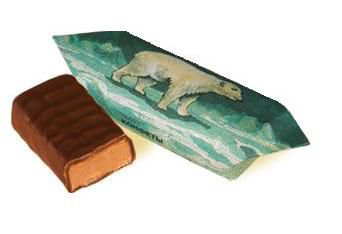 Конфеты Мишка на севере 500г. Глазированные шоколадной глазурью с корпусами из масс пралине и типа пралине между слоями вафель. Состав: шоколадная глазурь (сахар, эквивалент масла какао, какао порошок, какао тёртое, эмульгаторы: Е322, Е476, ароматизатор идентичный натуральному (ваниль), сахар, ядро ореха миндаля тёртое, ядро ореха кешью тёртое, вафли листовые, масло какао, антиокислитель Е300, ароматизатор идентичный натуральному (ванильно - сливочный). Пищевая ценность (в 100г): белки -8,7г, жиры - 31,3г, углеводы - 54,4г. Энергетическая ценность - 528 Ккал. Хранить при температуре от 15С до 21С. Срок годности 9 месяцев.