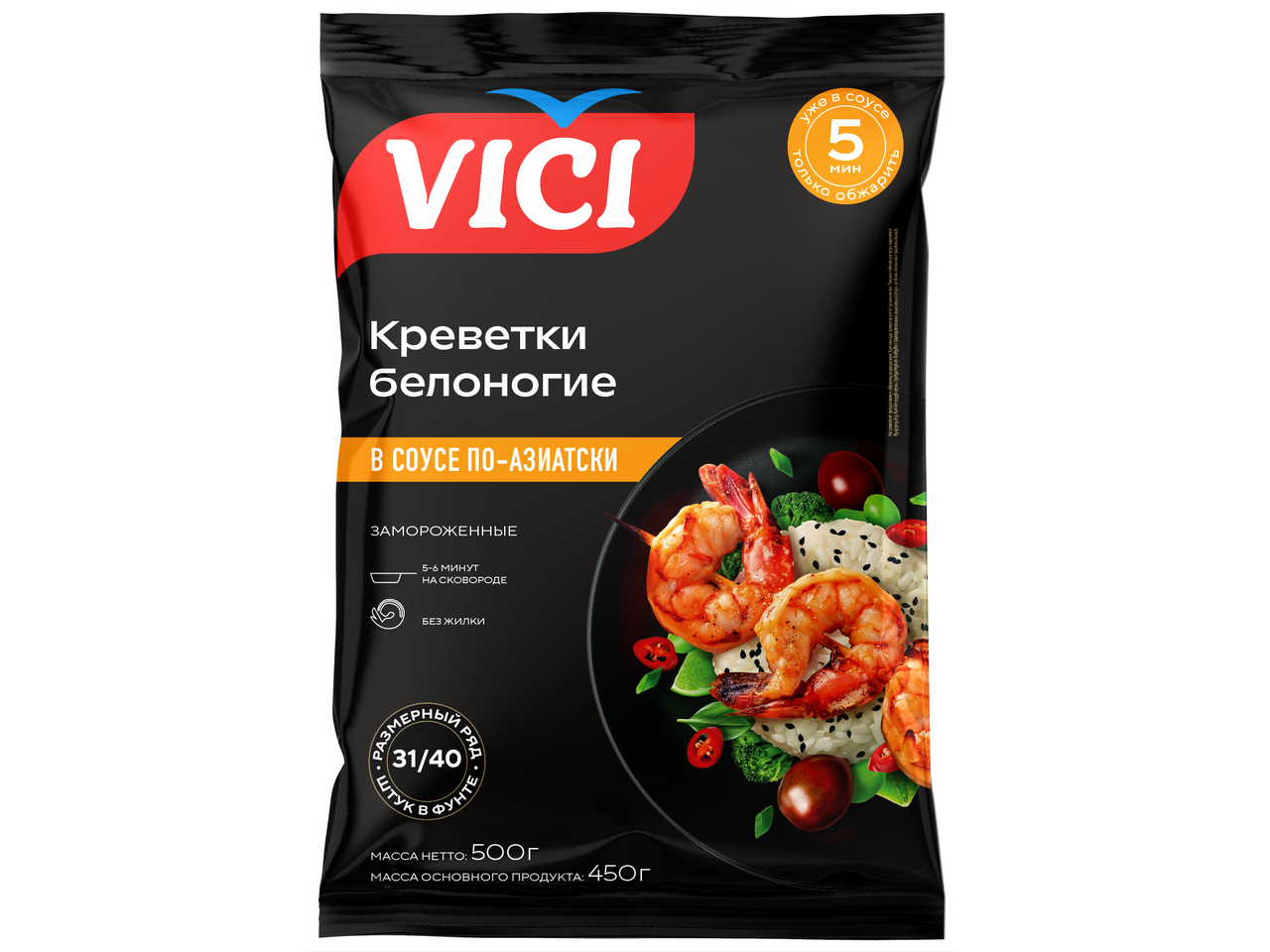 Креветки Vici белые премиум очищенные в соусе по-азиатски 31/40, 500г