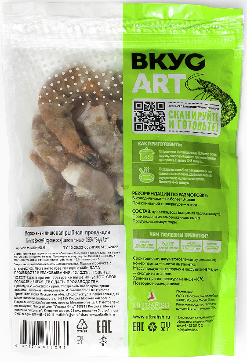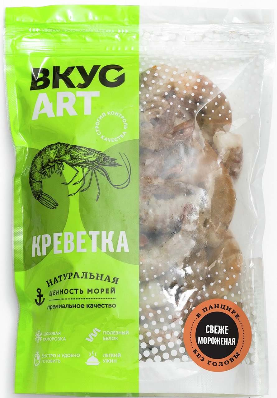Креветка источник полезного белка и аминокислот. Популярное лакомство для компании. Используется в многочисленных кулинарных рецептах. Свежемороженые креветки премиального качества. Употребление в пищу креветок - отличный способ увеличить потребление белка. В 100 граммах креветок примерно 15 граммов белка и очень мало жиров и углеводов. Королевские креветки - ценнейший белок, который является настоящим кладезем минералов. В составе калий, натрий, фосфор, сера, магний, кальций, железо, медь, цинк, марганец, йод, фтор, хром, кобальт, никель, молибден и др. Кроме этого, мясо креветок содержит и витамины: E, C, PP, B1, B2, В3, B6, B9, B12, A, H. Отличаются сочным и нежным мясом. В готовом виде они сохраняют текстуру мяса и имеют особенный, самобытный вкус. Блюда из креветок дают долгое насыщение, легко усваиваются организмом. Лучше всего подходит для салата, супа, пасты, ризотто, легкой закуски или самостоятельного блюда.