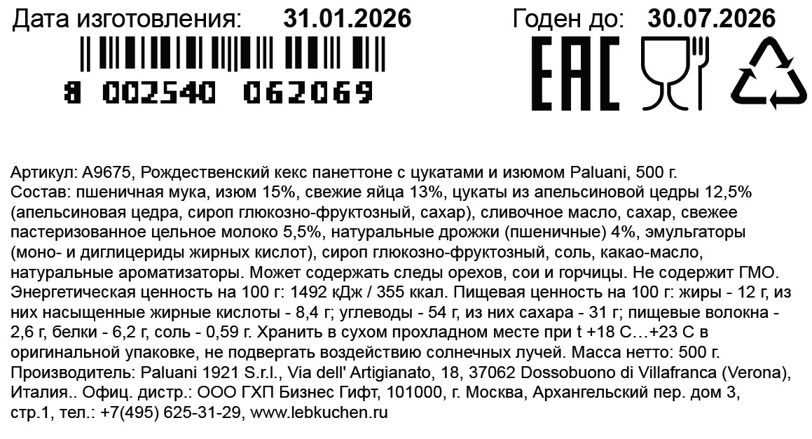 Пшеничная мука, изюм 15%, цукаты из цедры апельсина 13% (цедра апельсина, сироп глюкозно-фруктозный, сахар), свежие яйца 12%, масло сливочное (молоко), сахар, свежее пастеризованное цельное молоко 5,2%, натуральная закваска (пшеничная), эмульгатор: моно- и диглицериды жирных кислот, соль, какао-масло, ароматизаторы.