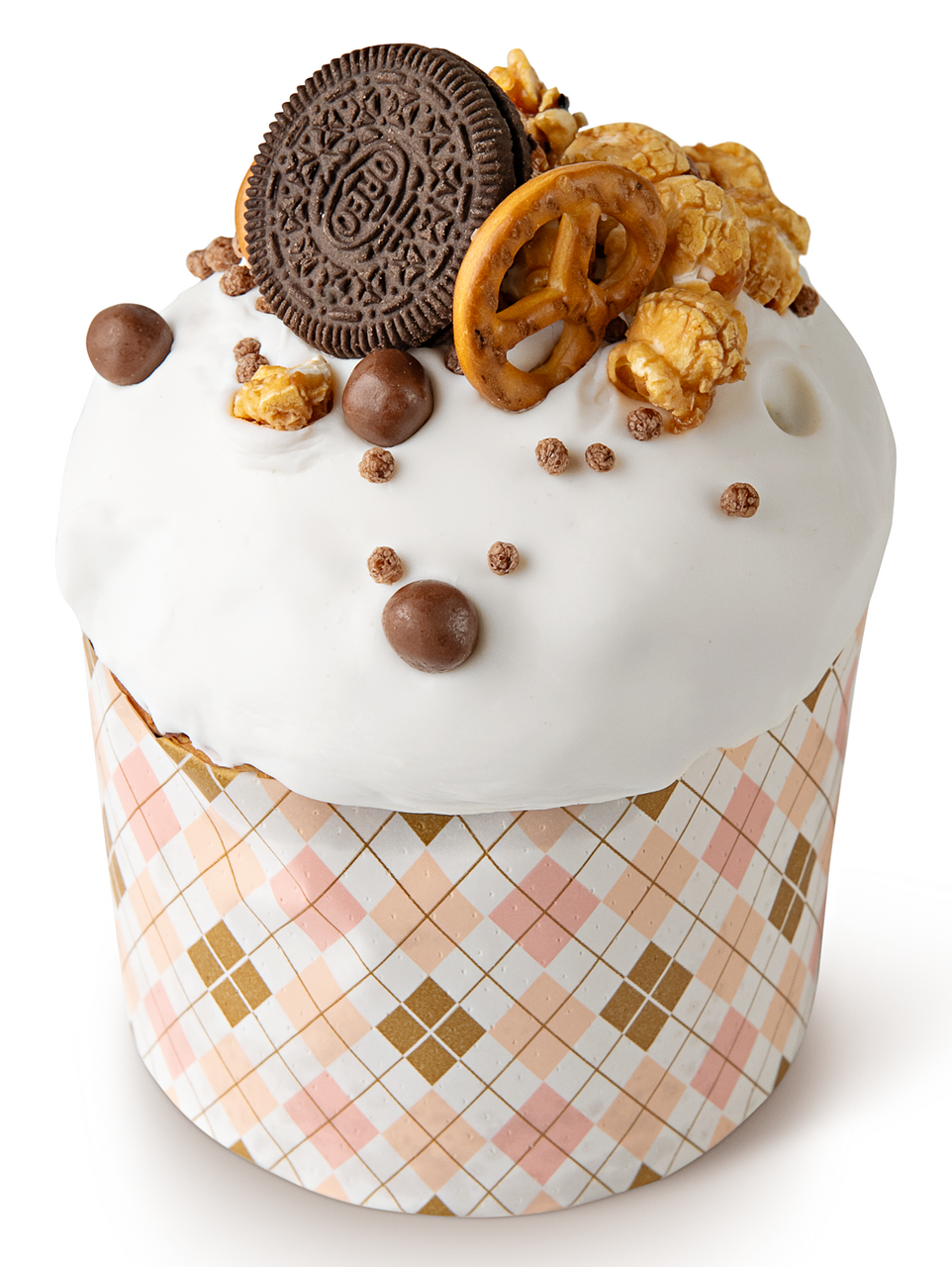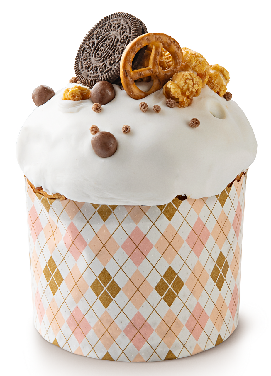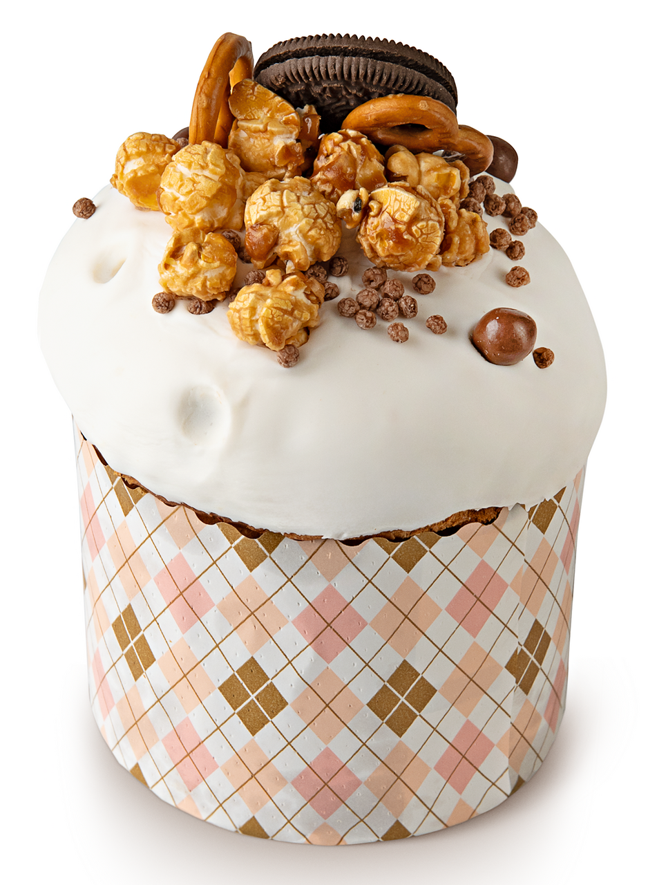 Крупный пасхальный кулич из сдобного дрожжевого теста, с центром из начинки соленой карамели. Украшен сладкой сахарной помадкой, попкорном и крендельками.