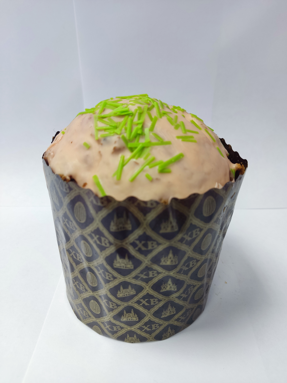 Изготовлен из бисквитного теста без добавления дрожжей. Содержит творог. Подается на Пасху, станет отличным пасхальным подарком для родных и близких. Можно подать к столу как самостоятельный богатый десерт. Он отлично сочетается с молоком и молочными продуктами. Выпечен по традиционной рецептуре в бумажной термоформе, глазирован белой помадкой, украшен яркой разноцветной сахарной посыпкой.