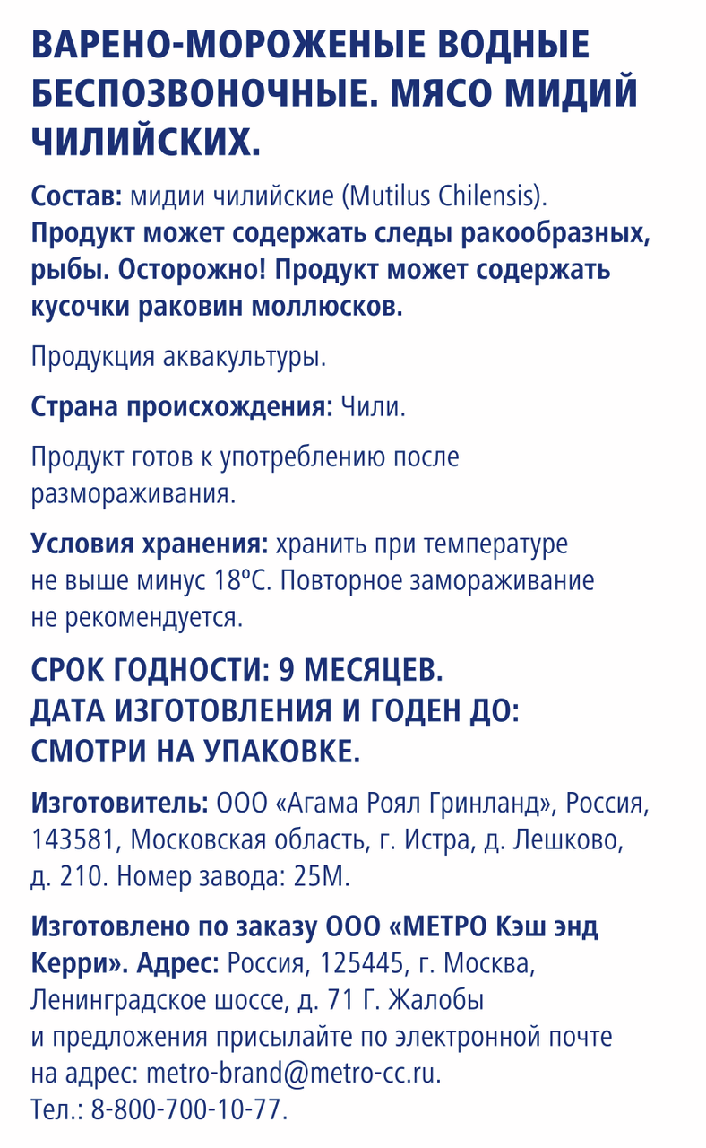 Мясо мидий — деликатес, обожаемый гурманами во всем мире. Наши мидии доставляются из Чили где они растут в экологически чистых водах Тихого океана. Предварительно размороженные мидии можно отварить или запечь в духовке, а лучшим дополнением к ним будет белое вино и лимонный сок.