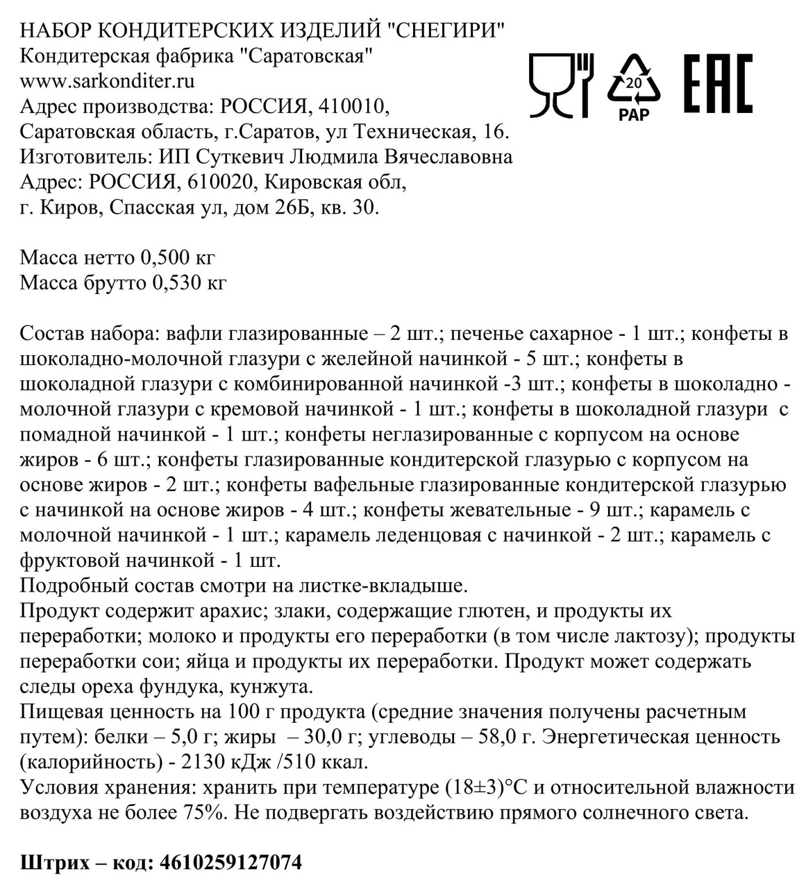 Сахар, патока крахмальная, мука пшеничная хлебопекарная, эквивалент масла какао рафинированные дезодорированные фракционированные растительные масла масло ши, пальмовое масло, эмульгатор Е322 соевые лецитины, сыворотка молочная сухая, какао-порошок, заменитель масла какао нетемперируемый нелауринового типа рафинированные дезодорированные растительные масла в модифицированном виде подсолнечное масло, фракции пальмового масла, эмульгатор лецитины соевые, жир специального назначения рафинированные дезодорированные растительные масла в натуральном и модифицированном виде пальмовое масло и его фракции, пальмоядровое масло, подсолнечное масло, эмульгатор лецитины соевые, антиокислители Е320, Е321, заменитель масла какао нетемперируемый лауринового типа полностью гидрогенизированный пальмоядровый растительный жир, эмульгаторы Е492, Е322 соевого происхождения, халва подсолнечная ядро подсолнечника тёртое, патока крахмальная, сахар, пенообразователь экстракт мыльного корня, ароматизатор Ванилин, пищевой натуральный антиокислитель концентрат смеси токоферолов, какао тёртое, заменитель молочного жира рафинированные дезодорированные растительные масла в натуральном и модифицированном виде пальмовое масло и его фракции, подсолнечное масло, эмульгаторы Е471, лецитины соевые, антиокислитель аскорбилпальмитат, краситель бета-каротин, вода питьевая очищенная, пюре из яблок, пюре черносмородиновое, пюре апельсиновое, эмульгаторы лецитины соевые, Е492, Е471, желирующий агент пектины яблочные, стабилизатор камедь рожкового дерева, молоко сухое цельное, арахис, орех фундук, меланж яичный сухой, регуляторы кислотности кислота лимонная, цитрат натрия 3-замещенный, продукт экструдированных круп и зернового сырья ПЭК Рис воздушный крупа рисовая.