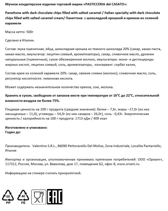 Панеттоне Del Casato с шоколадной крошкой и соленой карамелью, 500г