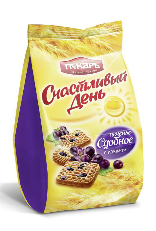 Печенье сдобное с изюмом, 500 г. Состав: мука пшеничная хлебопекарная в/с, растительный жир, виноград сушеный, сахарная пудра, инвертный сироп (сахар, регулятор кислотности - кислота лимонная пищевая), экстракт солодовый, яичный порошок, крахмал кукурузный, соль поваренная пищевая, разрыхлителя (карбонат аммония, бикарбонат натрия), эмульгатор - лецитин, ароматизаторы: ''Ванильно-сливочный'', идентичный натуральному. Продукт может содержать незначительное количество арахиса, молочных продуктов, семян мака, кунжута, подсолнечника и льна. Противопоказано при индивидуальной непереносимости к яичному белку. Пищевая ценность на 100 г : белки - 7,2 г, жир - 20,5 г, углеводы - 66 г. Энергетическая ценность на 100 г: 463 ккал Хранить при температуре от (13-23)С и относительной влажности воздуха не более 75%
