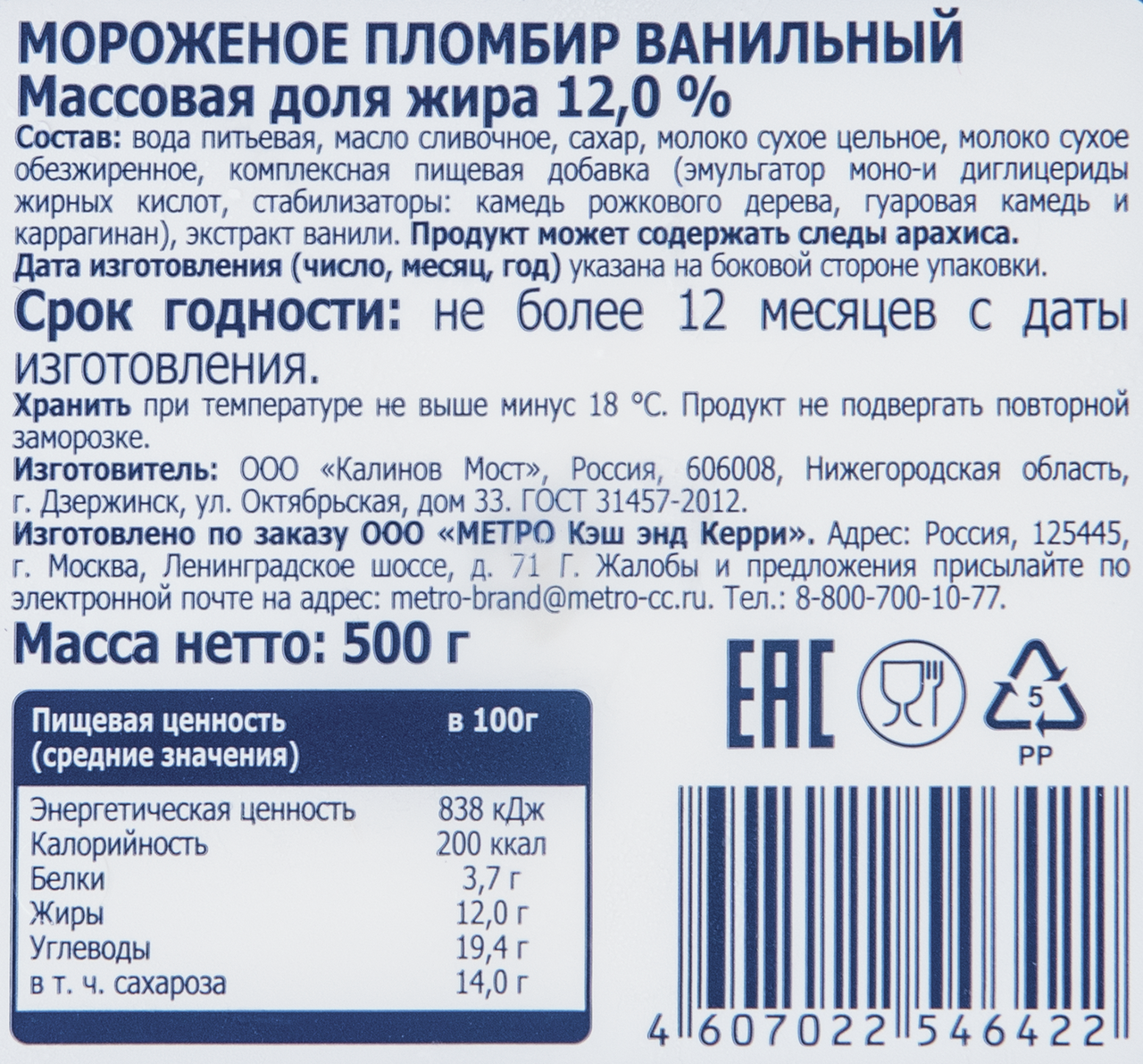 METRO Chef Мороженое пломбир Ванильное, 500г