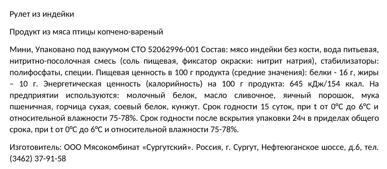 Имеет характерный вкус и пикантный аромат натурального копчения. Мясной продукт идеально подходит для сервировки праздничного стола. Применение классической рецептуры обеспечивает насыщенный вкус продукта и сохранение полезных веществ, содержащихся в диетическом мясе.