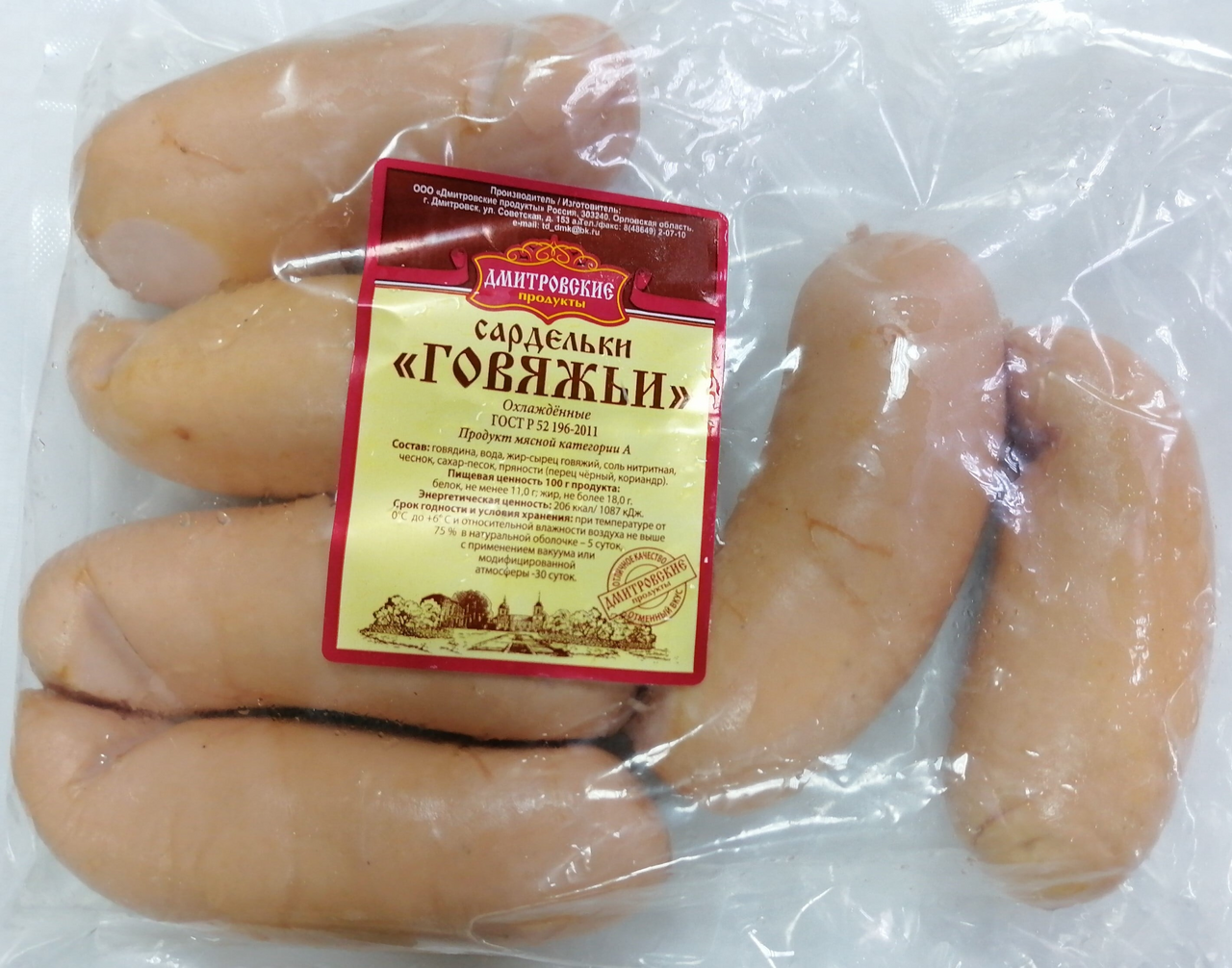 Сардельки Дмитровские продукты Говяжьи, ~500г изготовлены из высококачественного сырья в соответствии ГОСТу. Традиционный вкус этих сарделек хорошо знаком каждому с детства. Их легко готовить. Можно сочетать с любым гарниром или подавать как самостоятельное блюдо.