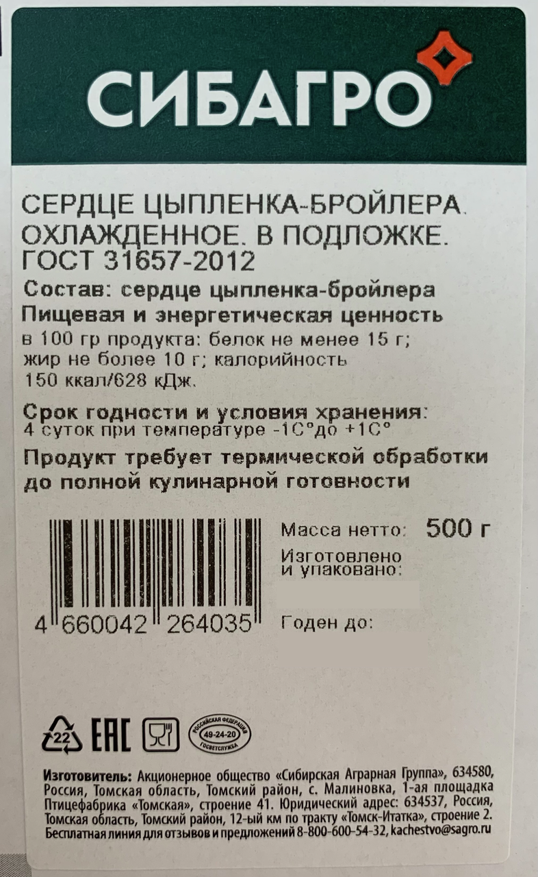 Сердце цыпленка-бройлера Сибагро охлажденное, 500г