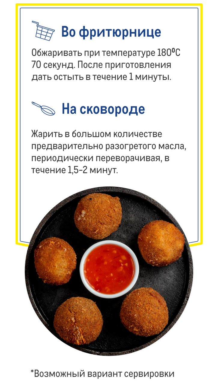METRO Chef Шарики сырные в панировке замороженные, 500г — основа для создания оригинальной закуски к повседневному или праздничному столу. Продукт изготовлен из натертого твердого сыра и панировочной смеси на основе пшеничной муки, воды, дрожжей, растительного масла. Добавка измельченного лука, чеснока и перца халапеньо придает готовому блюду яркие вкусовые акценты. Полуфабрикат полностью готов к термообработке — обжариванию в масле во фритюрнице или на сковороде. Горячие румяные шарики обладают хрустящей корочкой и сочной начинкой, которая буквально тает во рту. В теплом виде их можно подавать к столу на шпажках, а в холодном — выложить горкой на блюдо и оформить молодой зеленью или свежими овощами. Продукт легко усваивается, укрепляет организм и радует нежным сливочным вкусом. В морозильной камере он может храниться в течение 6 месяцев, и выручит всегда, когда захочется побаловать близких чем-то особенным.