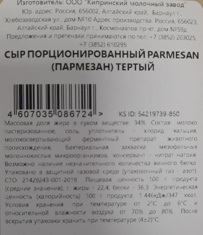 Сыр Parmesan торговой марки Киприно – твердый сыр с итальянскими корнями. Срок созревания данного сыра – 6 месяцев, благодаря чему он имеет плотную консистенцию без рисунка, пикантный вкус и глубокий аромат с нотками лесного ореха. Пармезан употребляется как самостоятельное блюдо или используется в виде добавок к пасте, пицце, супам и салатам.