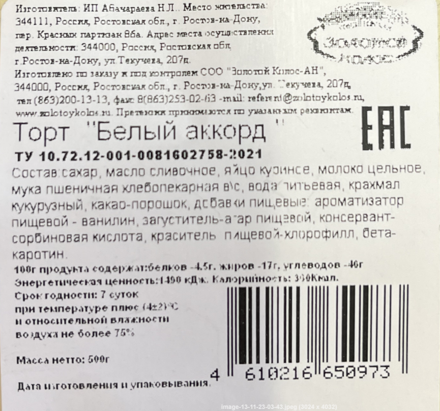 Сахар, масло сливочное, яйцо куриное, молоко цельное, мука пшеничная хлебопекарная в/с, вода питьевая, крахмал кукурузный, какао-порошок, добавки пищевые: ароматизатор пищевой – ванилин, загуститель - агар пищевой, консервант - сорбиновая кислота, красители пищевые – хлорофилл, кармин, бета-каротин.