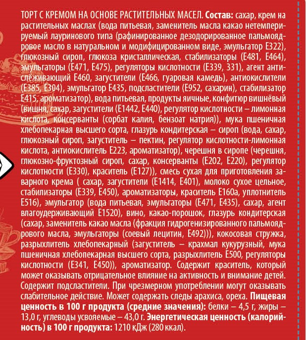 Крем на растительных маслах (вода питьевая, заменитель масла какао нетемперируемый лауринового типа (рафинированное дезодорированное пальмоядровое масло в натуральном и модифицированном виде, эмульгатор е322), глюкозный сироп, глюкоза кристаллическая, стабилизаторы (е481, е464), эмульгаторы (е471, е475), регуляторы кислотности (е339, 331), агент антислеживающий е460, загустители (е466, гуаровая камедь), антиокислители (е385, е304), эмульгатор е435, подсластители (е952, сахарин), стабилизатор е415, ароматизатор), сахар, вода питьевая, продукты яичные, конфитюр вишневый (вишня, сахар белый, загустители (е1442, е440), регулятор кислотности - лимонная кислота, консерванты (сорбат калия, бензоат натрия)), мука пшеничная хлебопекарная высшего сорта, глазурь кондитерская - сироп (вода, сахар, глюкозный сироп, загуститель-пектин, регулятор кислотности-лимонная кислота, антиокислитель е223, ароматизатор), смесь сухая для приготовления заварного крема (сахар, загустители (е1414, е401), молоко сухое цельное, стабилизаторы (е339, е450), ароматизаторы, краситель е160а, уплотнитель е516), черешня в сиропе (черешня, глюкозно-фруктозный сироп, сахар, консерванты (е202, е220), регулятор кислотности (е330), краситель (е127)), эмульгатор (вода питьевая, эмульгаторы (е471, е435), сахар, агент влагоудерживающий е1520),глазурь кондитерская темная (сахар, заменитель какао масла (фракция гидрогенизированного пальмоядрового масла, эмульгаторы (соевый лецитин, е492)), какао-порошок, сухие молочные продукты, эмульгаторы (соевый лецитин, е476), ароматизатор), вино, какао-порошок, глазурь кондитерская белая (сахар, заменитель какао масла (фракция гидрогенизированного пальмоядрового масла, эмульгаторы (соевый лецитин, е492))), разрыхлитель хлебопекарный (загуститель - крахмал кукурузный, мука пшеничная хлебопекарная высшего сорта, разрыхлитель е500, регуляторы кислотности (е341, е450)), ароматизатор, крем на растительных маслах (вода питьевая, заменитель масла какао нетемперируемый лауринового типа (рафинированное дезодорированное пальмоядровое масло в натуральном и модифицированном виде, эмульгатор е322), глюкозный сироп, глюкоза кристаллическая, стабилизаторы (е481, е464), эмульгаторы (е471, е475), регуляторы кислотности (е339, 331), агент антислеживающий е460, загустители (е466, гуаровая камедь), антиокислители (е385, е304), эмульгатор е435, подсластители (е952, сахарин), стабилизатор е415, ароматизатор), сахар, вода питьевая, продукты яичные, конфитюр вишневый (вишня, сахар белый, загустители (е1442, е440), регулятор кислотности - лимонная кислота, консерванты (сорбат калия, бензоат натрия)), мука пшеничная хлебопекарная высшего сорта, глазурь кондитерская - сироп (вода, сахар, глюкозный сироп, загуститель - пектин, регулятор кислотности - лимонная кислота, антиокислитель е223, ароматизатор), смесь сухая для приготовления заварного крема (сахар, загустители (е1414, е401), молоко сухое цельное, стабилизаторы (е339, е450), ароматизаторы, краситель е160а, уплотнитель е516), черешня в сиропе (черешня, глюкозно-фруктозный сироп, сахар, консерванты (е202, е220), регулятор кислотности (е330), краситель (е127)), эмульгатор (вода питьевая, эмульгаторы (е471, е435), сахар, агент влагоудерживающий е1520),глазурь кондитерская темная (сахар, заменитель какао масла (фракция гидрогенизированного пальмоядрового масла, эмульгаторы (соевый лецитин, е492)), какао-порошок, сухие молочные продукты, эмульг