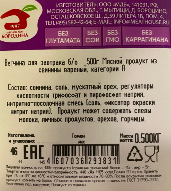 Ветчина Мясной дом Бородина для завтрака, 500г