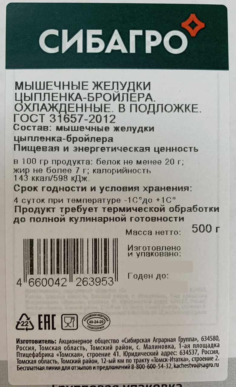 Желудки цыпленка-бройлера Сибагро охлажденные, 500г