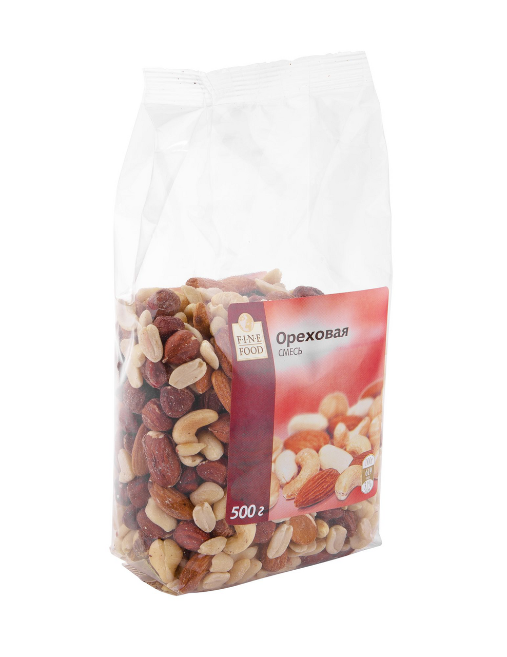 Ореховая смесь Fine Food, 500г. Состав: арахис, фундук, миндаль, кешью. Условия хранения: t от +5'C до +25'C и относительной влажности воздуха не более 75%.