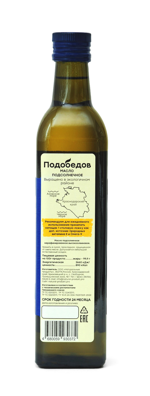 Масло подсолнечное Подобедов нерафинированное высокоолеиновое, 500мл