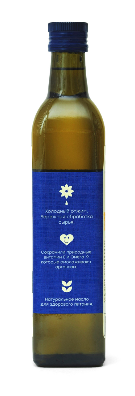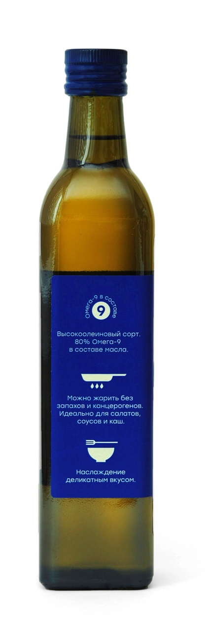 Масло подсолнечное высокоолиеновое холодного отжима, добывается путём холодного прессования из семян элитных сортов подсолнечника эталонного качества. Масло содержит более 80% Олеиновой кислоты и Витамин Е в легкоусовяемой форме. Масло имеет лёгкий запах нежаренных семян подсолнечника и слегка уловимый ореховый привкус. Используется для приготовления горячих блюд на огне и жарке, салатов, каш, консерваций и соусов.