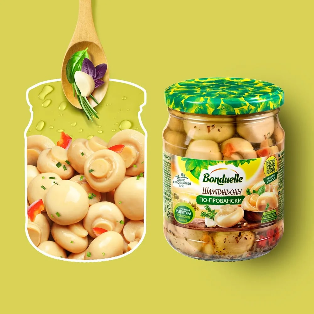 Уникальный продукт, рецептура которого была специально разработана шеф-поваром Бондюэль. Грибочки бережно собраны, тщательно промыты и подобраны один к одному. А придать им пряность и легкую сладость помогают прованские травы и красный болгарский перец. Просто откройте банку и вуаля – на столе готовая пикантная закуска! Продукт не содержит искусственных добавок и ГМО. Упакован в стеклянную банку с герметичной крышкой.