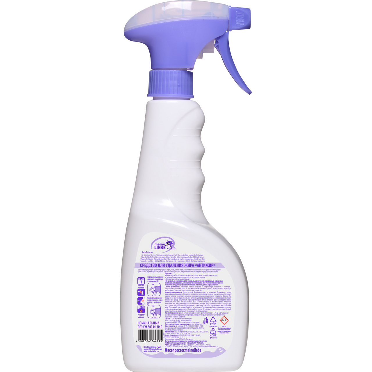 Экологичное, эффективное решение для удаления стойких, пригоревших загрязнений на различных кухонных поверхностях. Спрей-антижир Meine Liebe обеспечивает безупречную чистоту и блеск кухни без резкого запаха, оставляя приятный аромат. Специальная формула моющего средства позволяет эффективно удалять пригоревшие остатки пищи, въевшийся жир и грязь, бережно очищая поверхности без повреждений и царапин. Состав чистящего средства не содержит хлора, фосфатов, красителей. Эффективная концентрированная формула позволяет сокращать расход средства, быстро удаляя самые стойкие, застарелые загрязнения с первого применения (при использовании спрея согласно инструкции на этикетке). Фирменный триггер Meine Liebe помогает экономично использовать средство, а сам флакон удобно сидит в руке, облегчая процесс уборки в доме. Спрей-антижир Meine Liebe обеспечивает безупречную чистоту и блеск плиты (индукционной, газовой, стеклокерамической), стеклянных столов, духовки, решетки, противня, вытяжки, сковороды, кастрюли, чайников, микроволновой печи, гриля, шампуров, кафеля и пластика. Специальная формула моющего средства позволяет эффективно удаляет пригоревшие остатки пищи, въе��шийся жир и грязь, копоть, нагар, жирные следы в холодильнике, при этом спрей бережно очищает поверхности без царапин, оставляя свежий цитрусовый аромат.
