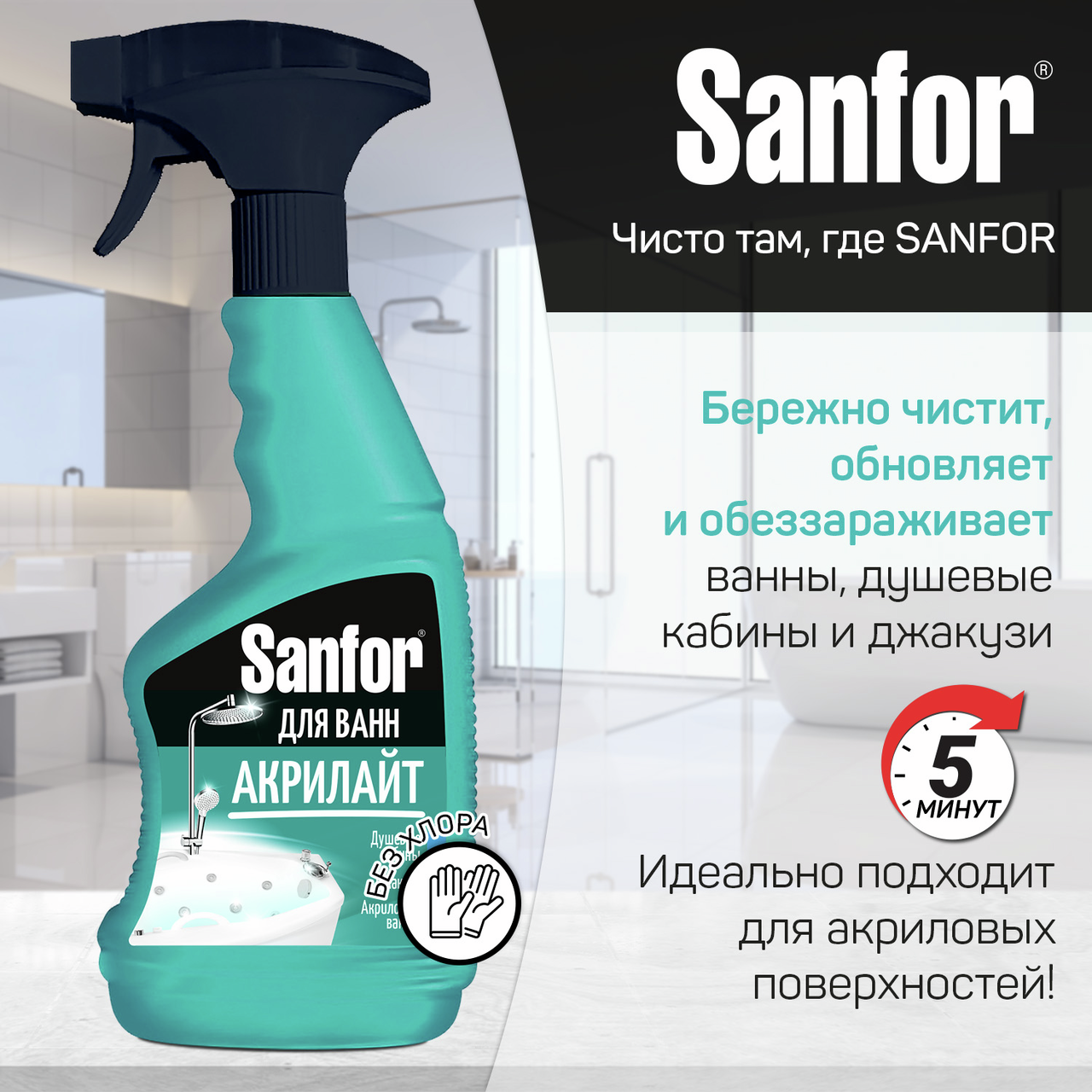 Чистящее средство спрей-пена для ванны Sanfor — универсальное решение для эффективной уборки и поддержания чистоты ванной комнаты и сантехники. Спрей Sanfor эффективно очищает от известкового налета поверхности акриловых ванн, раковин, джакузи, сантехники и кафеля. Удаляет мыльные разводы и солевые отложения, придает блеск сантехнике. Средство обладает антибактериальным и антимикробным эффектом, обеспечивая надежное обеззараживание, не содержит хлора и абразивных частиц. Специальная формула с лимонной и молочной кислотой эффективно удаляет мыльные отложения и оставляет свежий и приятный запах после мытья. Спрей идеально подходит для акриловых поверхностей. Подходит для ежедневного применения. Безопасность, экономичный расход и удобство в использовании обеспечивает удобный мультитриггер спрей-пена с блокиратором. Sanfor — это гигиеническая чистота и свежесть ванной комнаты!