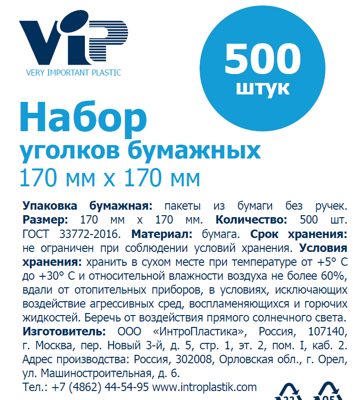 Уголок Vip бумажный белый 17 x 17см, 500шт
