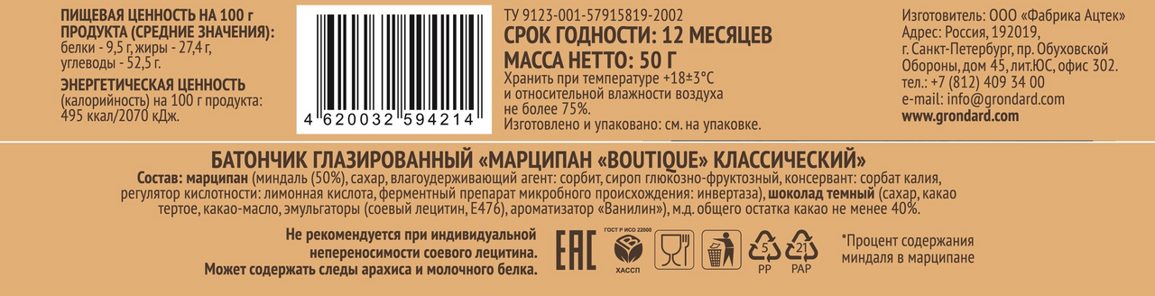 Батончик марципановый Grondard Boitique классический, 50г