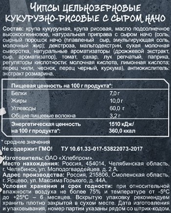 Крупа кукурузная, крупа рисовая, масло подсолнечное высокоолеиновое, натуральная приправа с сыром начо соль, сырный порошок начо плавленый сыр, эмульгирующая соль, молочный жир; декстроза, мальтодекстрин, сухая мКрупа кукурузная, крупа рисовая, масло подсолнечное высокоолеиновое, натуральная приправа с сыром начо соль, сырный порошок начо плавленый сыр, эмульгирующая соль, молочный жир; декстроза, мальтодекстрин, сухая молочная сыворотка, натуральные ароматизаторы дрожжевой экстракт, сыр, ароматизатор, томат, сахар, лук репчатый, паприка, регуляторы кислотности: молочная кислота, лимонная кислота; перец чили, чеснок, перец черный, куркума, антиокислитель: экстракт розмарина.