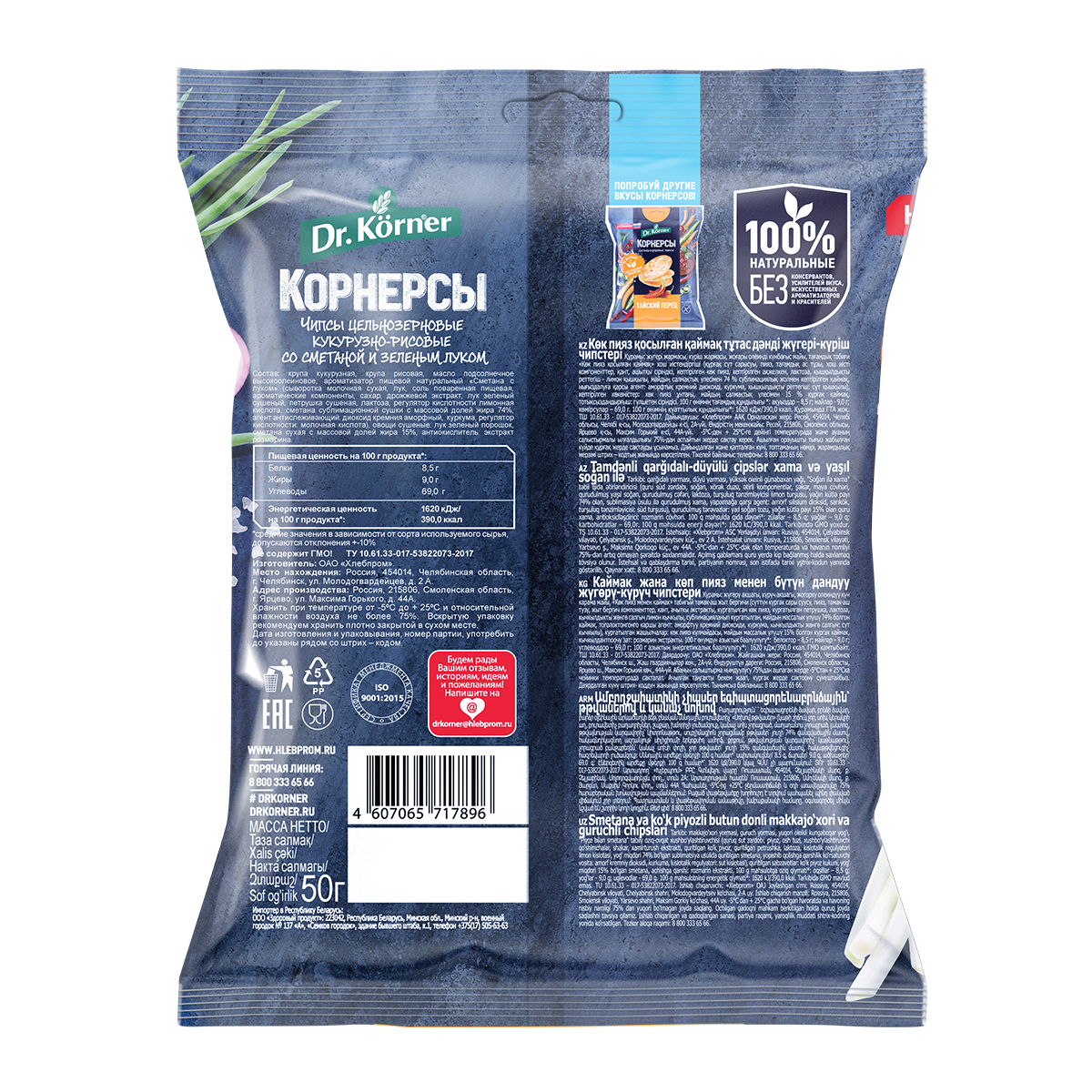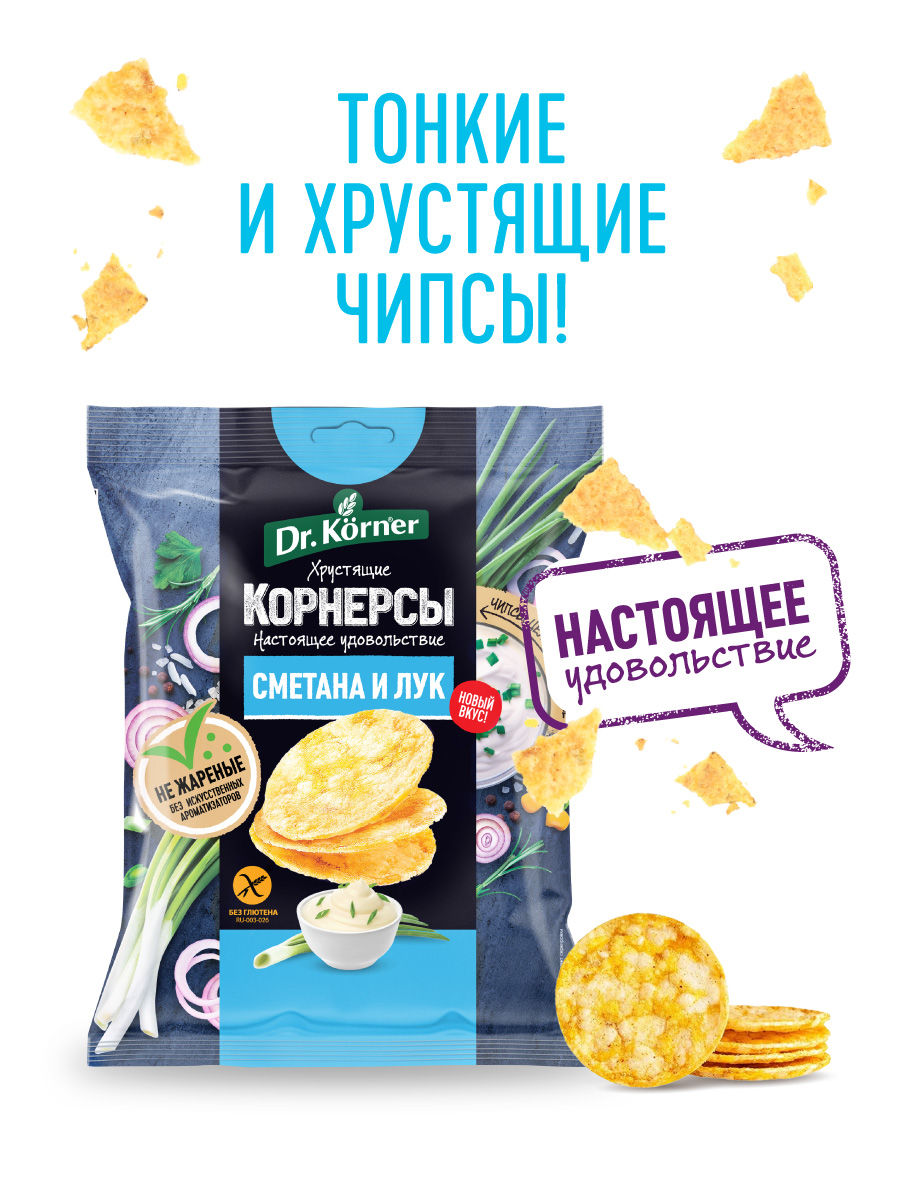 Хрустящие цельнозерновые чипсы с популярным вкусом: Сметана и лук. Не жарятся в масле, без искусственных ароматизаторов. Без глютена, подходят людям на безглютеновой диете. Используются натуральные приправы без усилителей вкуса. Это хрустящие корнерсы, которые состоят из цельных зерен кукурузы, риса и натуральной приправы сметаны с зеленым луком. Они приготовлены без усилителей вкуса, искусственных ароматизаторов и красителей. Такие чипсы – полезная замена вредных снеков с высоким содержанием жиров.