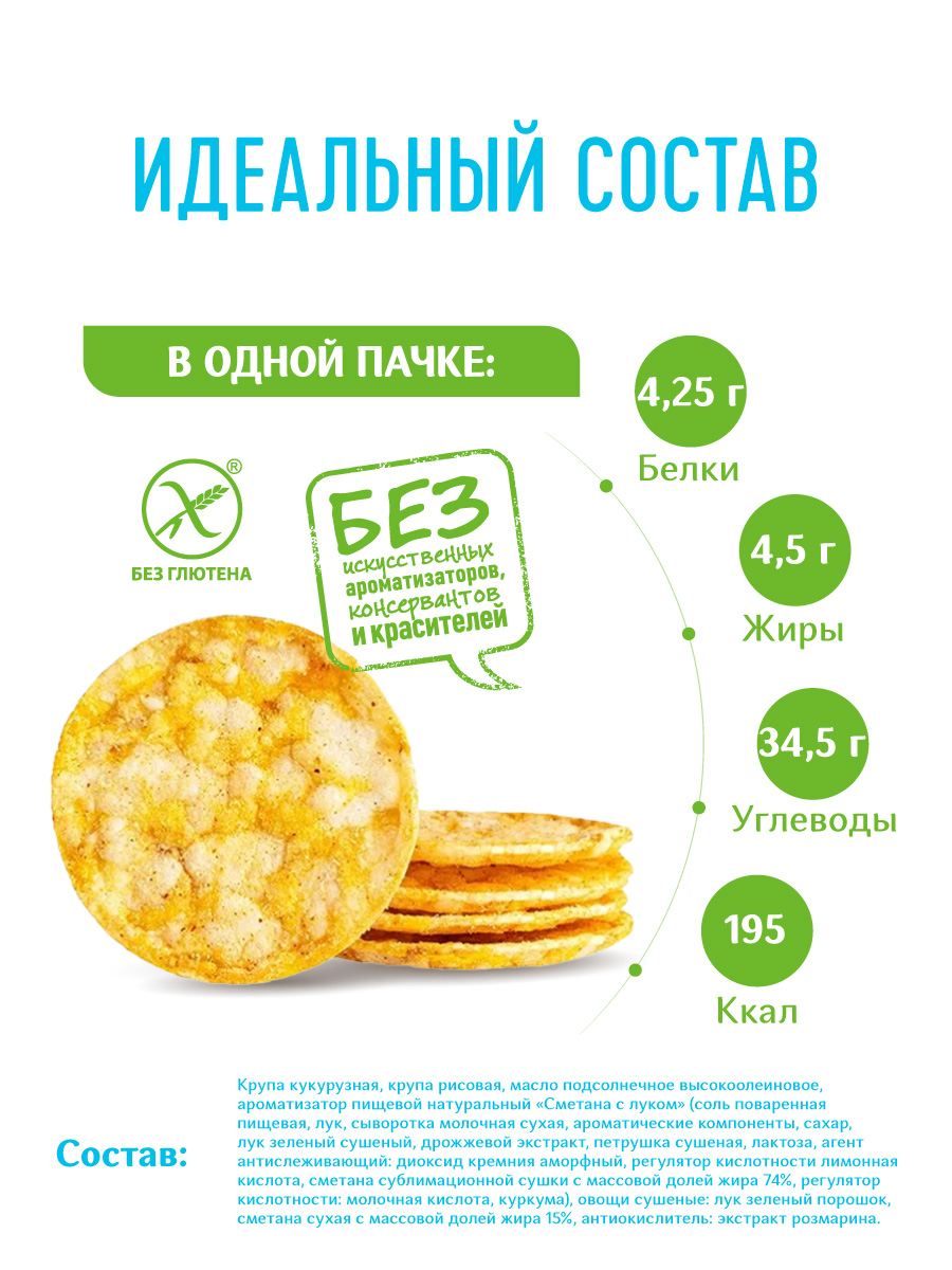 Крупа кукурузная и рисовая, масло подсолнечное, ароматизатор пищевой натуральный Сметана с луком (соль, лук, сыворотка молочная сухая, аромокомпоненты, сахар, лук зелёный сушёный, дрожжевой экстракт, петрушка сушёная, лактоза, агент антислеживающий (диоксид кремния аморфный), регулятор кислотности - лимонная кислота, сметана сублимационной сушки с массовой долей жира 74%, регулятор кислотности - молочная кислота, куркума), овощи сушёные: лук зелёный порошок, сметана сухая с массовой долей жира 15%, антиокислитель - экстракт розмарина.