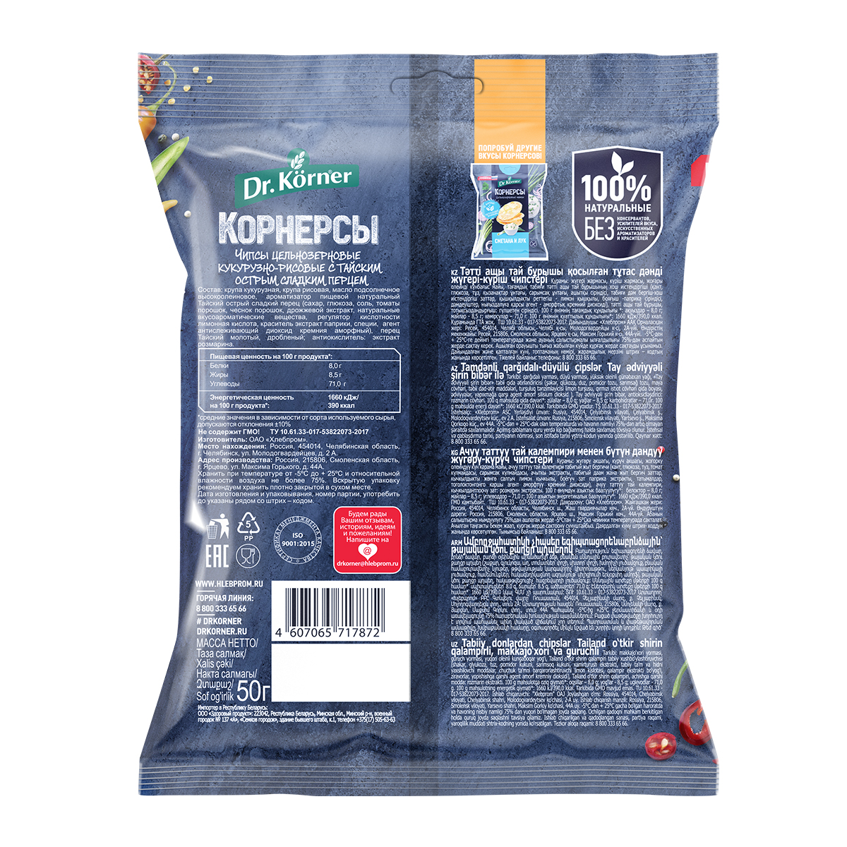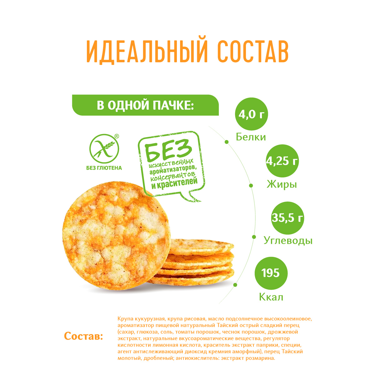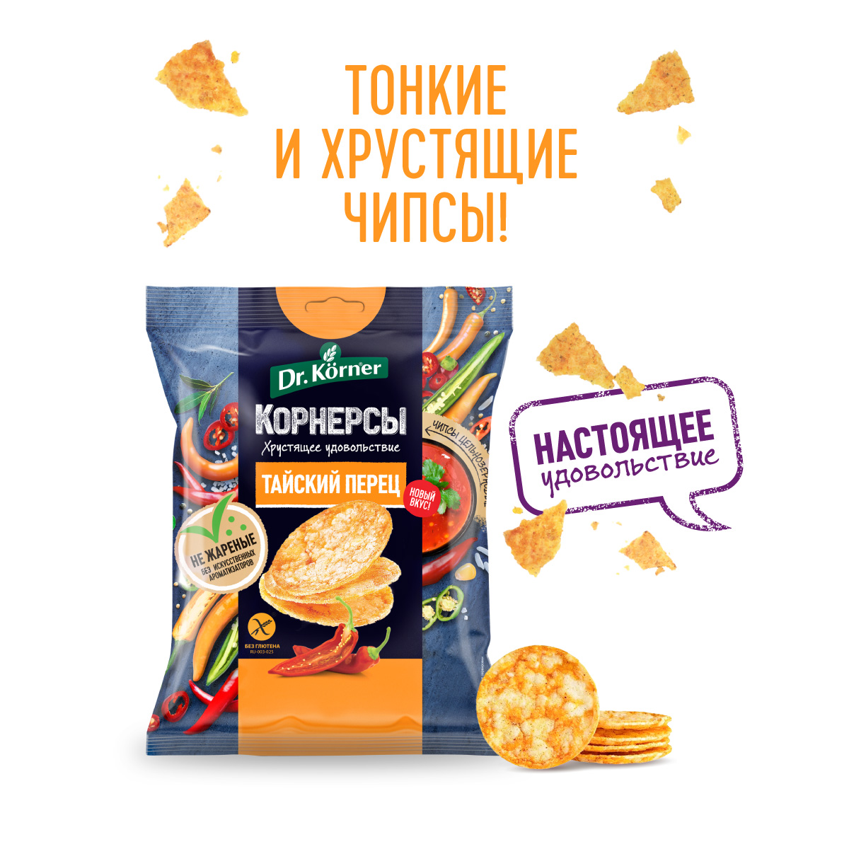 Хрустящие цельнозерновые чипсы с необычным вкусом, набирающим популярность: Тайский сладкий острый перец. Не жарятся в масле, без искусственных ароматизаторов. Без глютена, подходят людям на безглютеновой диете. Используются натуральные приправы без усилителей вкуса. Чипсы с тайским острым сладким перцем - это хрустящие корнерсы, которые состоят из цельных зерен кукурузы, риса и натуральной приправы тайского перца. Они приготовлены без усилителей вкуса, искусственных ароматизаторов и красителей. Такой продукт - полезная замена вредных снеков с высоким содержанием жиров. Яркий и при этом натуральный вкус тайского перца на цельнозерновой основе, технология производства без жарки, отсутствие глютена в составе – вот причины, по которым покупатели выбирают и любят корнерсы.