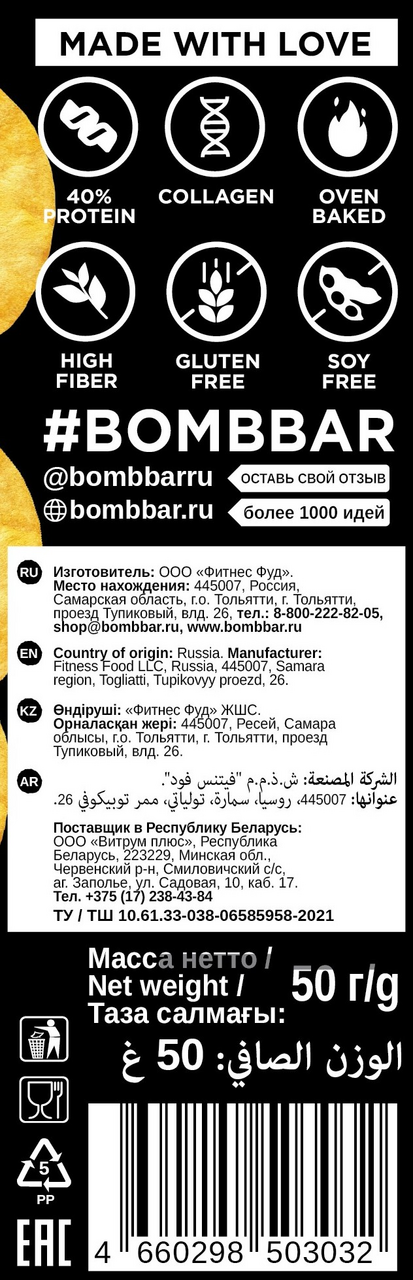 Цельнозерновые протеиновые чипсы Bombbar - это настоящее гастрономическое удовольствие, совершенное сочетание натуральных ингредиентов и великолепного вкуса. Без глютена. Без сахара. С высоким содержанием белка. Они идеально подходят для всех, кто стремится к здоровому образу жизни, не желая отказываться от вкусных снеков. Это отличный выбор для тех, кто хочет насладиться вкусным перекусом, не отказываясь от полезного питания. Эти чипсы обладают невероятным сырным вкусом и содержат высококачественный белок, который поддерживает мышцы и помогает поддерживать активный образ жизни. Они идеально подходят для перекуса между приемами пищи, а также для тех, кто следит за своим рационом и хочет добавить в него больше белка.