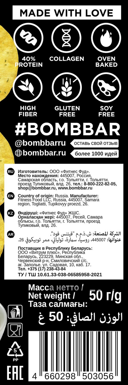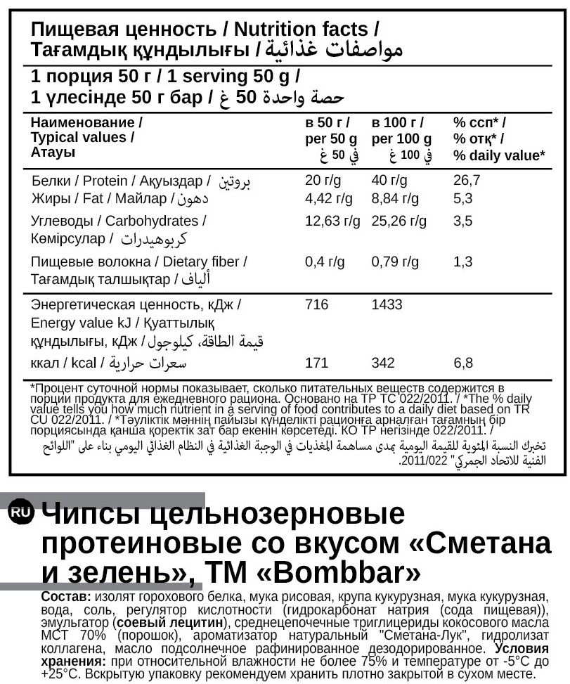 Цельнозерновые протеиновые чипсы Bombbar - это настоящее гастрономическое удовольствие, совершенное сочетание натуральных ингредиентов и великолепного вкуса. Без глютена. Без сахара. С высоким содержанием белка. Они идеально подходят для всех, кто стремится к здоровому образу жизни, не желая отказываться от вкусных снеков. Это здоровый и вкусный перекус для тех, кто следит за своим питанием. Хрустящие цельнозерновые ломтики с аппетитным ароматом свежей зелени и нежной сметаны порадуют приверженцев здорового образа жизни и спортсменов. Чипсы запекаются, а не жарятся, поэтому содержат минимум жира. Удобный формат подходит для работы, тренировок или отдыха. Отличный выбор для полезного перекуса без ущерба вкусу.