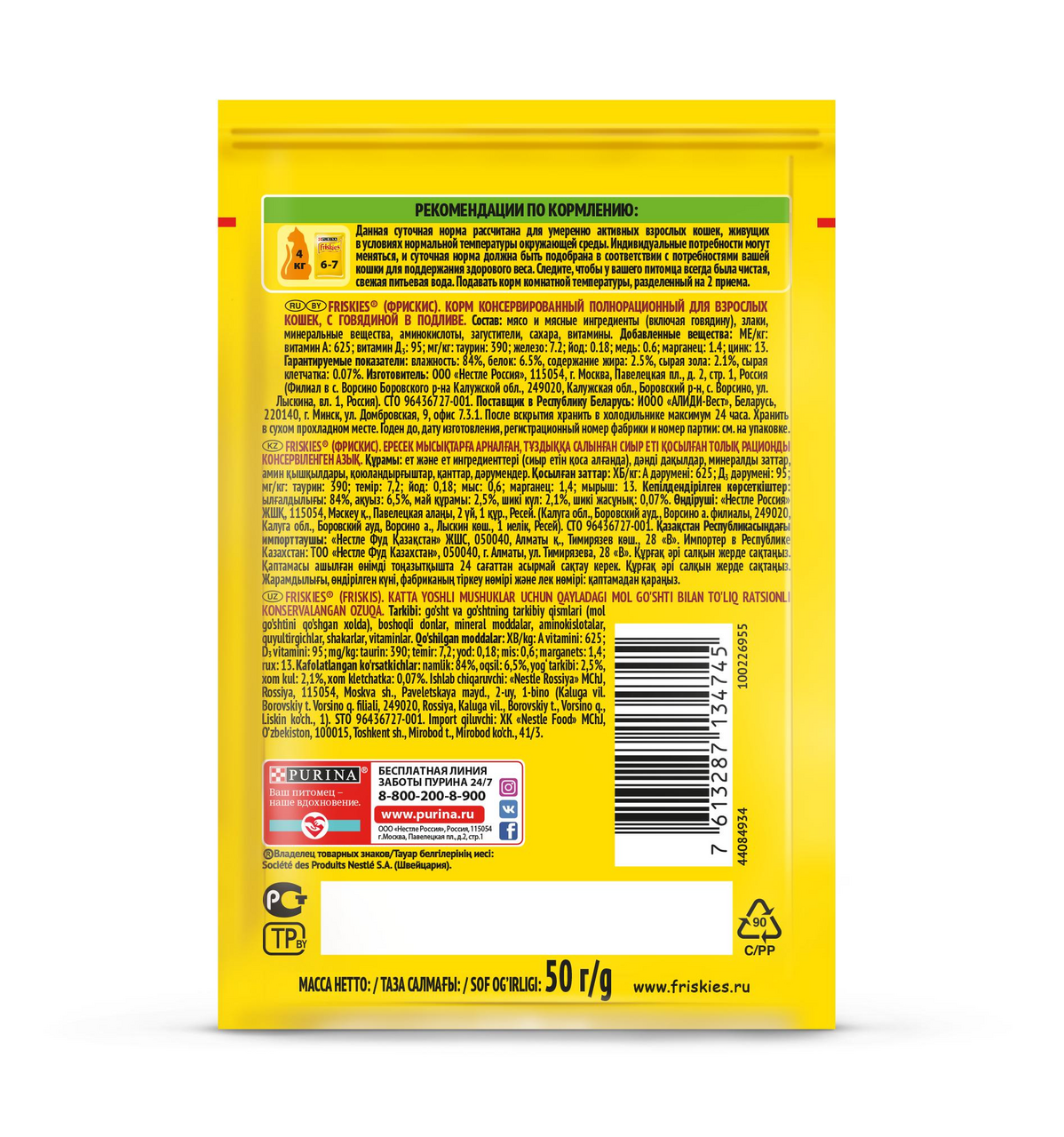Корм влажный Friskies для взрослых кошек с говядиной в подливе, 50г