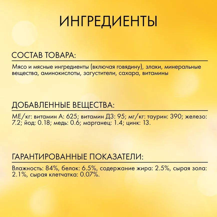 Мясо и мясные ингредиенты (включая говядину), злаки, минеральные вещества, аминокислоты, загустители, сахара, витамины.
