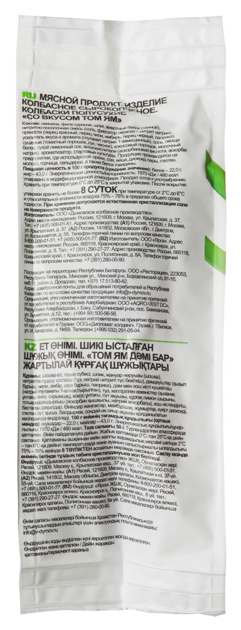 Колбаски со вкусом Том Ям - маленькие сырокопчёные колбаски с азиатским вкусом, которыми можно перекусить в любой ситуации. Удобную небольшую упаковку легко взять с собой в дорогу или на пикник.