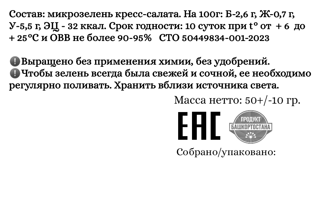 Смесь семян для проращивания. Богата каротином, витаминами С, В, йодом, минеральными солями и рутином. При регулярном употреблении в пищу оказывает общеукрепляющее действие, улучшает работу пищеварительной системы. Ростки сочные, с горьковатым пикантным вкусом, отдаленно напоминающим горчицу. Могут применяться в качестве витаминной добавки для салатов, соусов, мясных, рыбных блюд и супов.