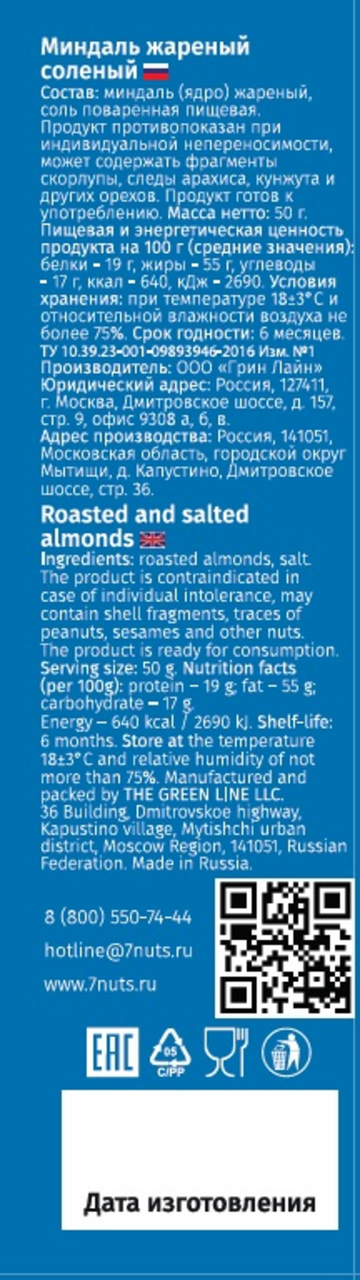 Миндаль Seven nuts жареный соленый, 50 г станет одним из компонентов перекуса. Сытное лакомство поможет быстро насытить организм энергией и побороть чувство голода. В составе продукта используются только натуральные ингредиенты. За основу взяты орехи миндаля. Ядра обладают приятным вкусом, который усиливается добавлением специй и морской соли. Миндаль полезен для жизнедеятельности организма. Он эффективно очищает кровь, нормализует работу печени и улучшает работу мозга. Этот орех богат витамином E, что важно для ежедневного рациона. Миндаль в компактной упаковке удобно брать с собой. С 2012 года производственная компания GreenLine готовила орехи - привозила из разных стран, обжаривала, упаковывала и развозила на прилавки известных магазинов. А в 2018 году основатели решили сделать свою торговую марку с качественными орехами и необычными вкусовыми сочетаниями. И назвать ее в честь 7 самых полезных в мире орехов. Так появился бренд Seven Nuts. Seven Nuts - это: экологичное производство (не вредит окружающей среде, а упаковка безопасна для человека и продукции), только свежее сырье (тщательно отбираемое сырье, из которого изготавливаются продукты Seven Nuts), собственные технологии (весь процесс производства ведется самостоятельно и на каждом этапе применяется лучшее решение для самого вкусного результата), вся продукция сертифицирована.