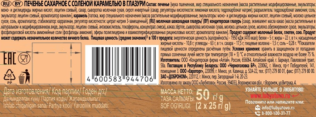 Печенье мука пшеничная, жир специального назначения масла растительные модифицированные, эмульгаторы: моно- и диглицериды жирных кислот, лецитин соевый, сахар, сыворотка молочная сухая, сироп инвертный сахар, регуляторы кислотности: лимонная кислота, гидрокарбонат натрия, разрыхлитель: гидрокарбонат аммония; соль, эмульгатор: соевый лецитин; ароматизатор ванилин, карамель патока, жир специального назначения масла растительные модифицированные, эмульгаторы: моно- и диглицериды жирных кислот, лецитин соевый, молоко цельное сухое, соль, ароматизатор, стабилизатор: каррагинан, регулятор кислотности: цитрат натрия 3-замещенный, молочная шоколадная глазурь кондитерская глазурь сахар, эквивалент масла какао масла растительные в натуральном и модифицированном виде, эмульгатор: соевый лецитин, антиокислитель: токоферолы, концентрат смеси, какао тёртое, сыворотка молочная сухая, молоко цельное сухое, молоко обезжиренное сухое, эмульгаторы: фосфатидиловой кислоты аммонийные соли фосфатиды аммония, эфиры полиглицерина и взаимоэтерифицированных рициноловых кислот; ароматизатор ванилин.
