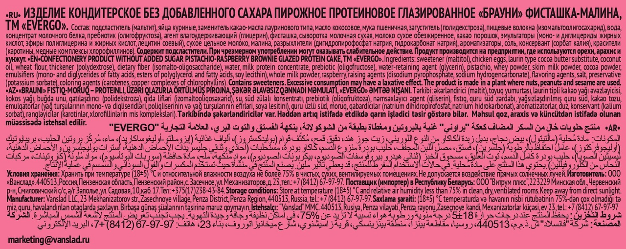 Пирожное протеиновое Evergo брауни фисташка и малина, 50г