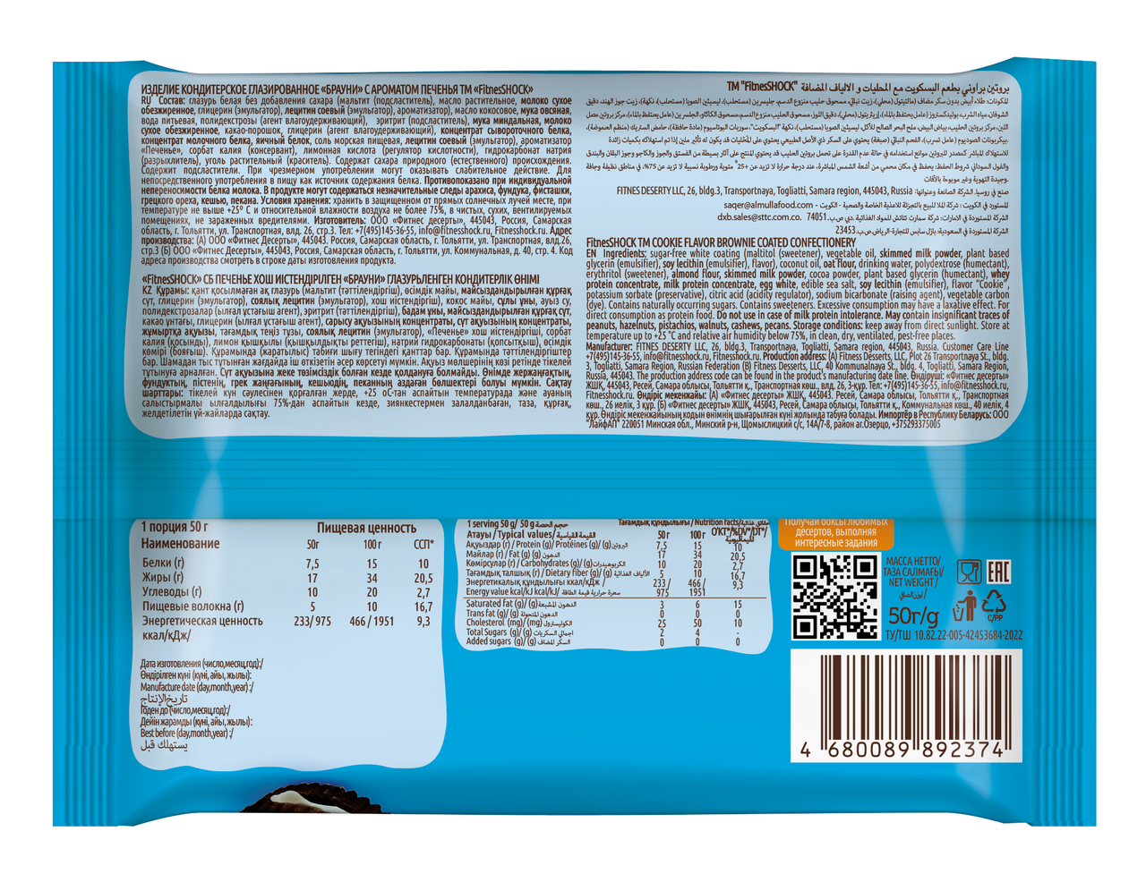 Пирожное протеиновое Fitness Shock брауни печенье со сливками, 50г х 12 шт