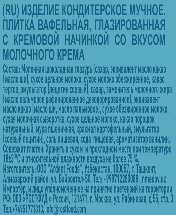 Молочная шоколадная глазурь (сахар, эквивалент масла какао (масло ши), сухое цельное молоко, сухое молоко обезжиренное, какао тертое, эмульгатор (лецитин соевый), сахар, заменитель молочного жира (масло пальмовое рафинированное дезодорированное), эквивалент масло какао (масло ши, масло пальмовое), сухое обезжиренное молоко, сухая молочная сыворотка, сухое цельное молоко, какао порошок натуральное, мука пшеничная, крахмал картофельный, эмульгатор (соевый лецитин), соль пищевая, сода пищевая, ароматизатор ванилин.