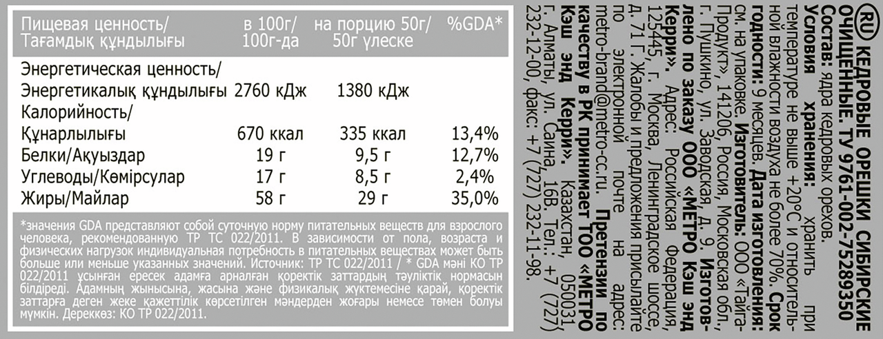 RIOBA Кедровые орешки очищенные 50 г – отличная добавка к салатам, соусам и основным блюдам. Они содержат белок, который быстро усваивается, а также большое количество микроэлементов, включая фосфор, медь, марганец и калий. В продукте присутствуют витамины Е, PP, B1, B2. В составе есть тиамин, который поддерживает память и улучшает настроение, и рибофлавин, повышающий иммунитет. Большое количество полезных веществ способствует улучшению состояния кожи, волос и ногтей, а клетчатка нормализует работу желудка и кишечника. Rioba – эксклюзивный бренд для баров, кафе и отелей. Обладая отличным качеством и запоминающимся дизайном, Rioba предлагает полное решение для бизнеса: от приготовления свежего кофе и оригинальных коктейлей до их сервировки. Цена на продукцию Rioba гораздо привлекательнее, чем у ведущих брендов того же уровня качества.