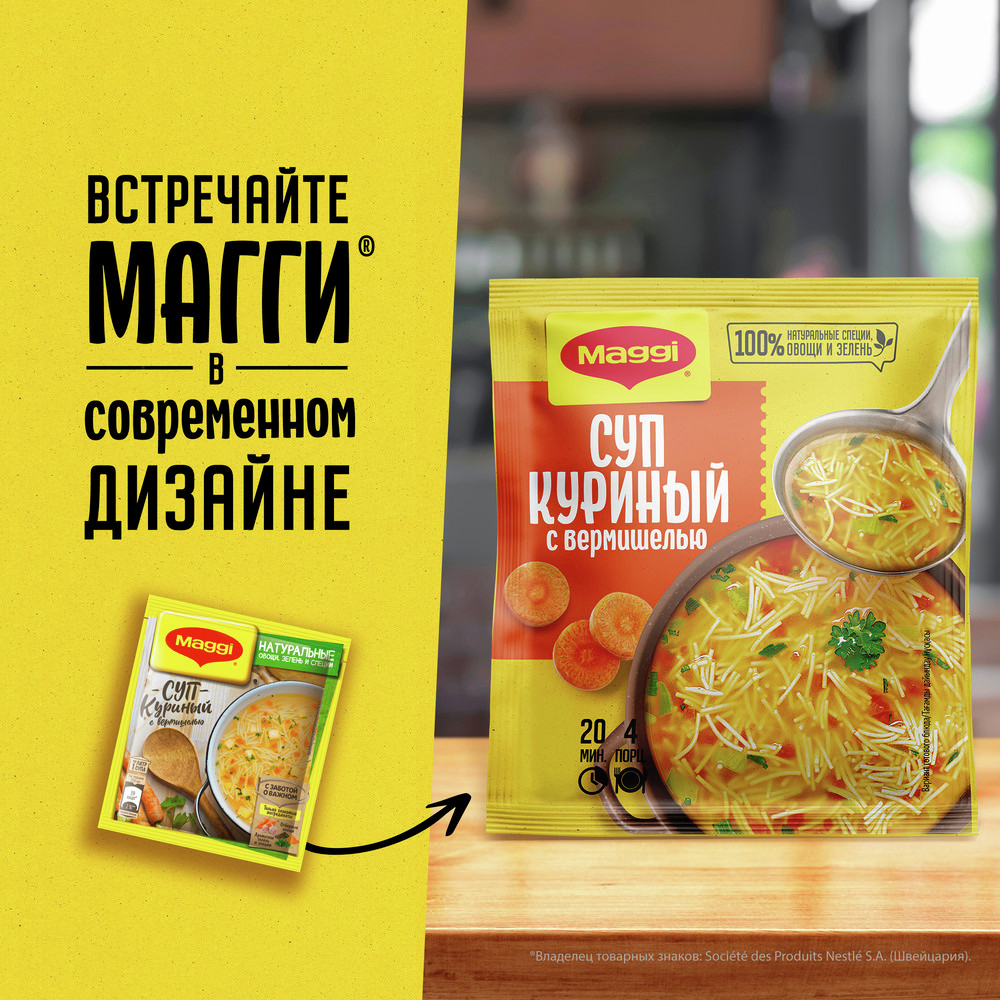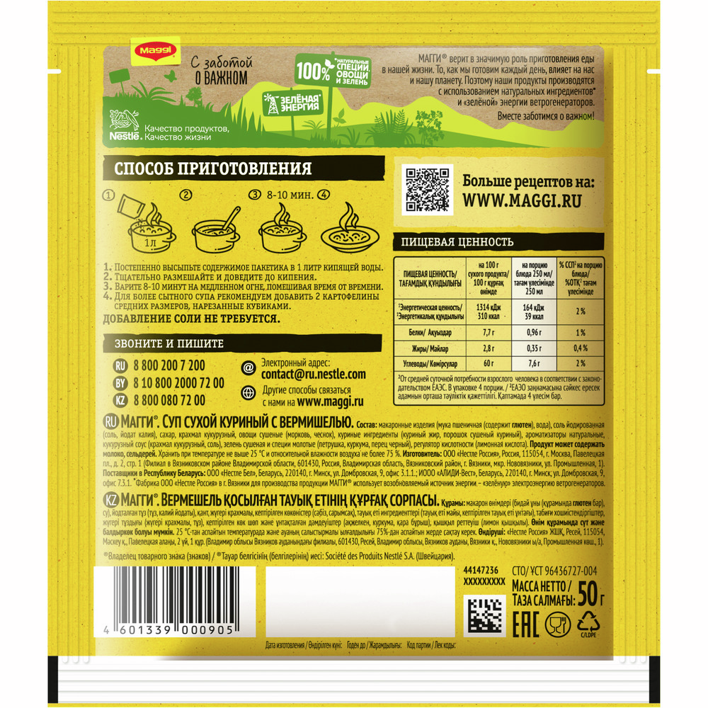 Maggi Суп куриный с вермишелью — это вкусный, ароматный и питательный суп, который поможет собрать за столом всю семью. В его состав входят только знакомые ингредиенты: овощи, вермишель высшего сорта, йодированная соль, ароматные специи.