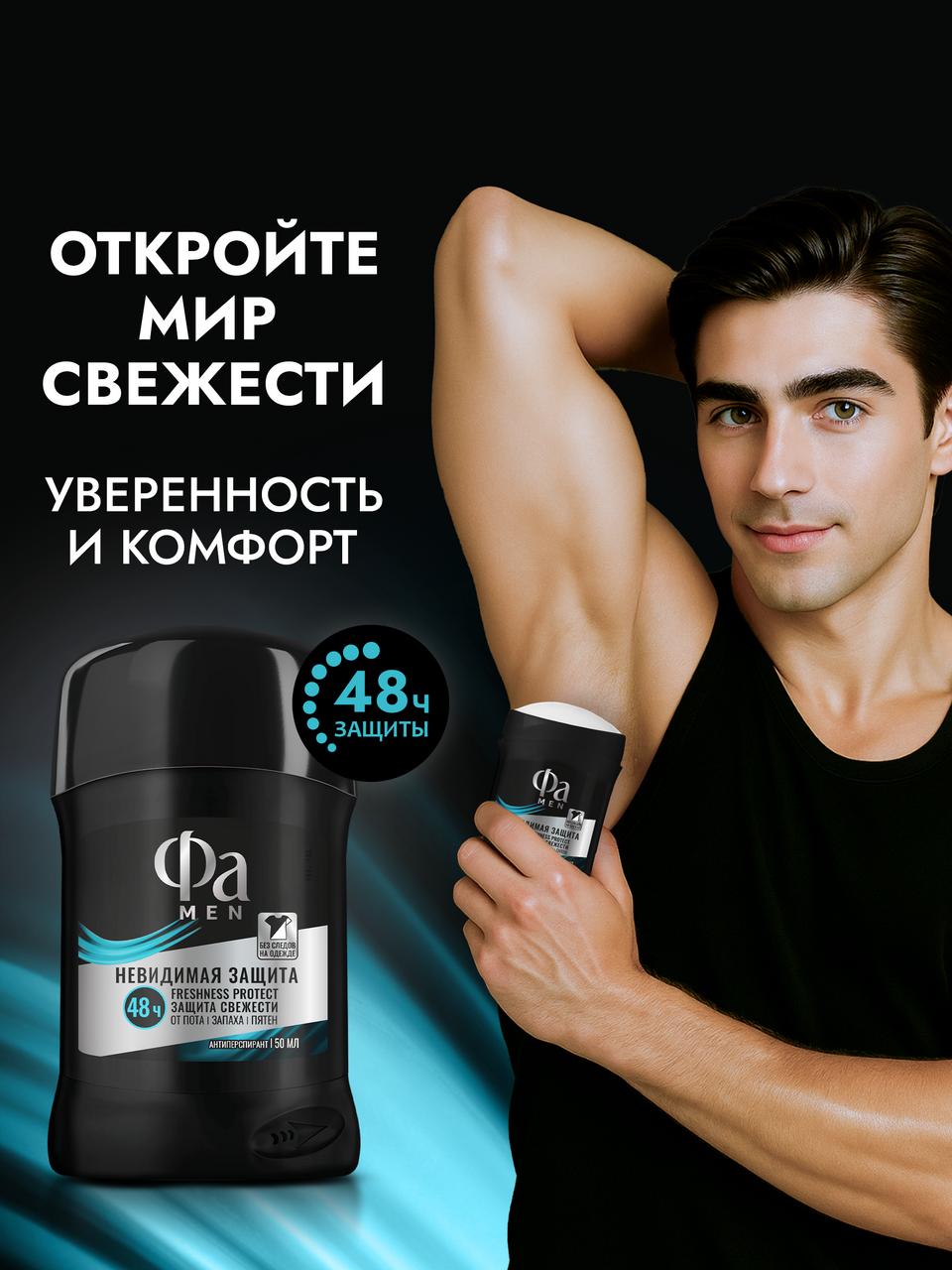 Антиперспирант-стик Фа Men Невидимая защита обеспечивает эффективную защиту от пота, неприятного запаха и пятен до 48 часов благодаря технологии Freshness Protect. Текстура стика оставляет ощущение сухости на коже защищает от желтых и белых следов пота на одежде. Дерматологически протестированная формула подходит для ежедневного использования. Freshness protect: тест в условиях повышенной температуры подтвердил: защита от пота до 48 часов Безопасно: формула дерматологически протестирована Нежная текстура: легко наносится и не липнет Удобный формат: компактный стик удобен в любой ситуации: дома, в зале и в путешествии.