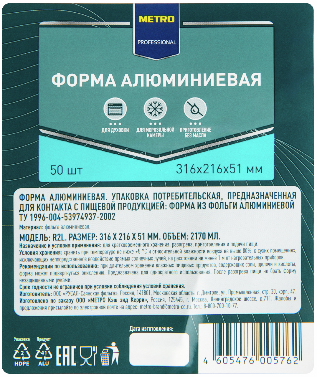 METRO PROFESSIONAL Форма алюминиевая 2170мл 316 x 216 x 51мм, 50шт