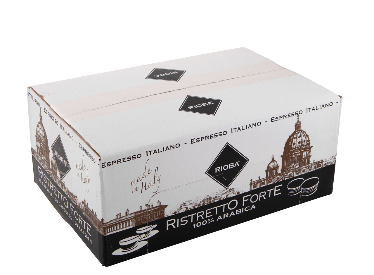 Кофе Rioba в капсулах. 50 герметичных капсул, обеспечивающих сохранение аромата свежемолотого кофе на долгие месяцы. Хранить в сухом прохладном месте при температуре не более 20'С и относительной влажности не более 75%. Срок годности 12 месяцев.